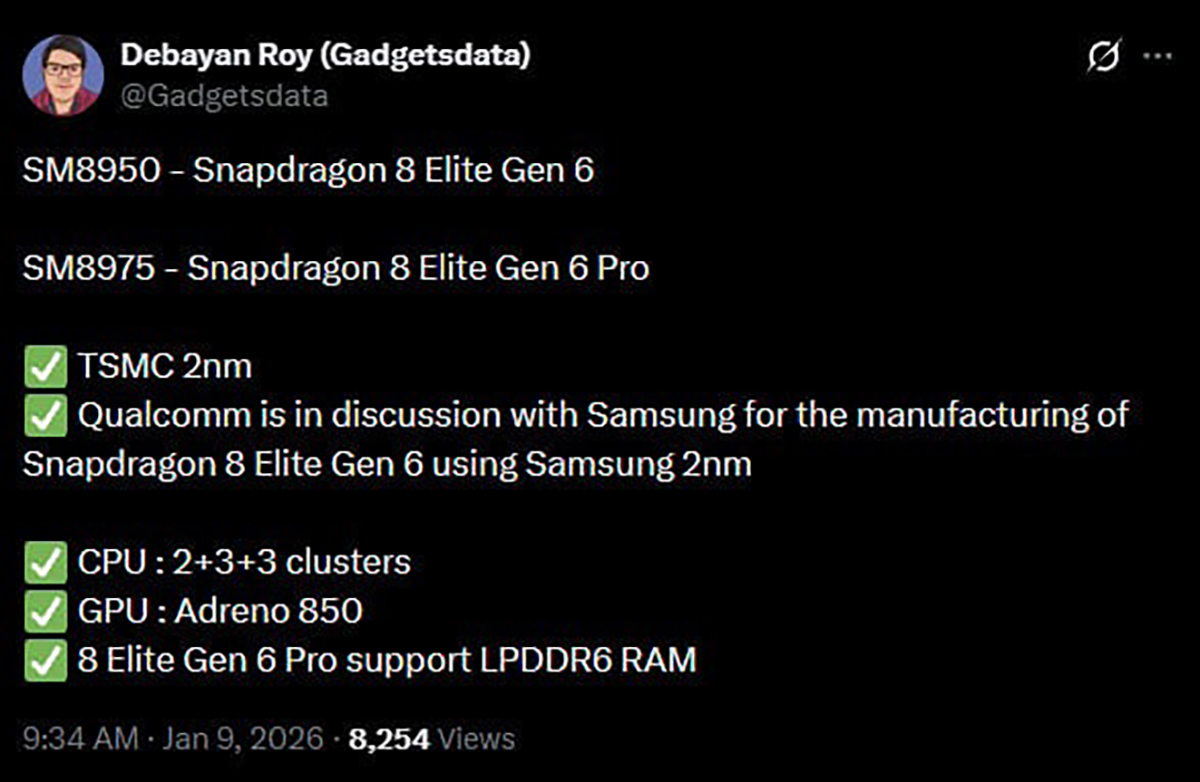 Qualcomm gần đây đã xác nhận việc đang tiến hành đàm phán với Samsung Foundry để phát triển các thế hệ chip Snapdragon mới. Theo tin đồn, Snapdragon 8 Elite Gen 6 sẽ có hai phiên bản: bản tiêu chuẩn và bản 'Pro'.