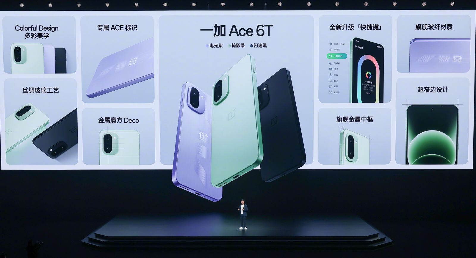 Thiết bị có ba màu sắc: Xanh lá, Đen và Tím. Ngoài ra, OnePlus cũng ra mắt phiên bản đặc biệt OnePlus Ace 6T Genshin Impact Kamisato Ayaka Edition với màu Xanh dương và họa tiết đặc trưng, giao diện tùy chỉnh, hiệu ứng sạc và cảm biến vân tay theo chủ đề. Phiên bản này đi kèm với hộp sưu tầm, ốp lưng riêng, thẻ Ayaka, móc khóa, que chọc SIM và sạc chuyên dụng.