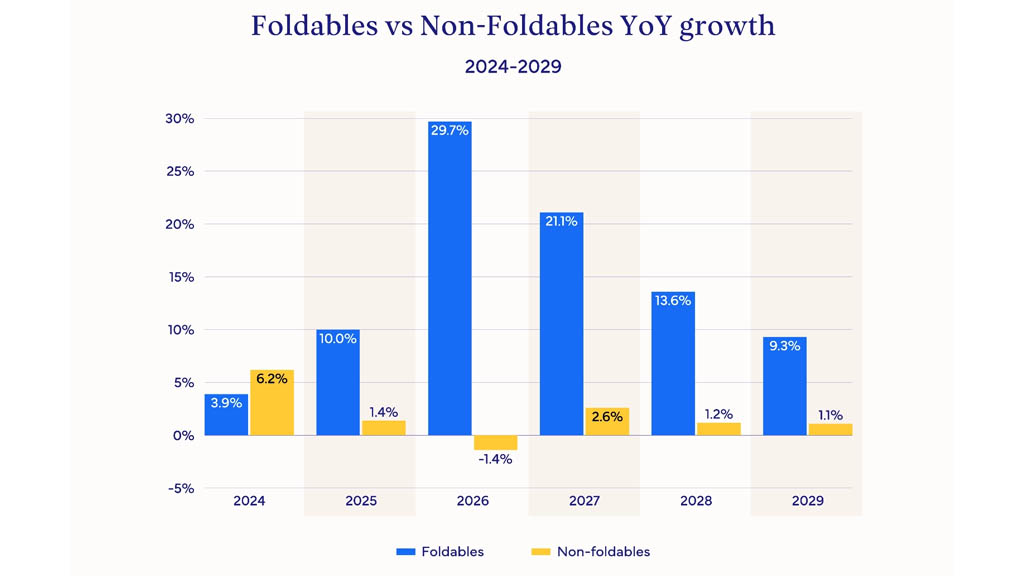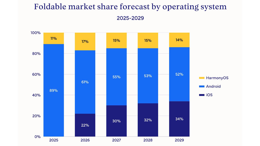 IDC còn cung cấp một biểu đồ dự báo thị phần smartphone gập dựa trên hệ điều hành cho giai đoạn 2025-2029. Theo đó, HarmonyOS có thể đạt 17% thị phần vào năm 2026, tăng từ 11%, dù sự xuất hiện của Apple có thể khiến thị phần này giảm trong những năm tới.