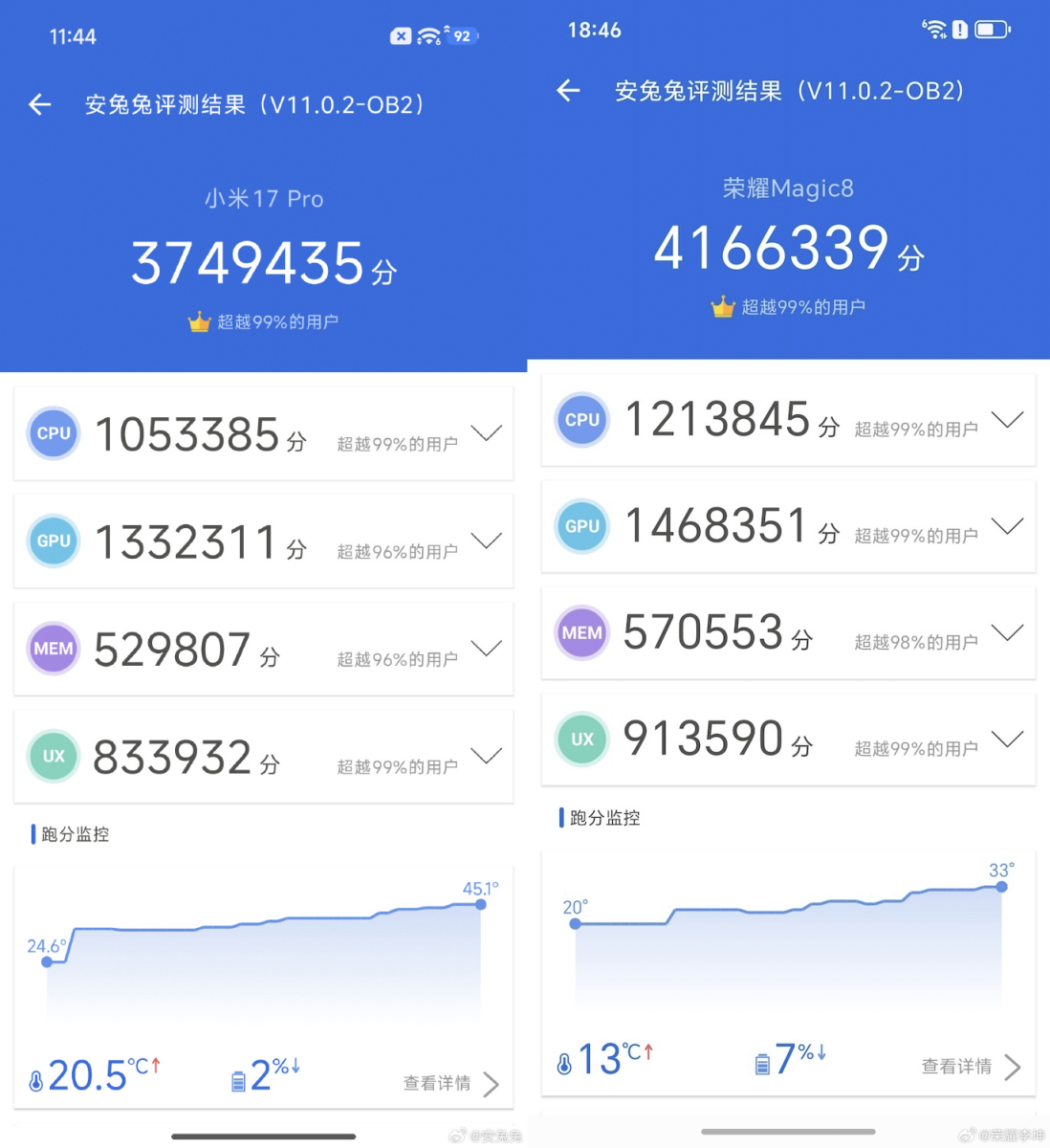 Trong các thử nghiệm hiệu năng bị rò rỉ, HONOR Magic 8 đạt điểm ấn tượng 4.166.339 trên AnTuTu V11, vượt qua Xiaomi 17 Pro khoảng 11%. Thiết bị này dẫn đầu về các tiêu chí CPU, GPU, bộ nhớ và UX, thể hiện sự tối ưu hóa vượt trội của HONOR trên nền tảng phần cứng mới.