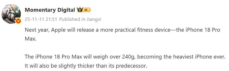 Một nguồn tin từ Weibo, cụ thể là leaker Instant Digital, vừa tiết lộ rằng Apple đang phát triển iPhone 18 Pro Max, một sản phẩm có khả năng lập kỷ lục về trọng lượng trong dòng smartphone của hãng. Chiếc điện thoại này dự kiến sẽ có trọng lượng trên 240 gram, nặng hơn cả iPhone 17 Pro Max với 233 gram, và các phiên bản tiền nhiệm như iPhone 14 Pro Max và iPhone 13 Pro Max.