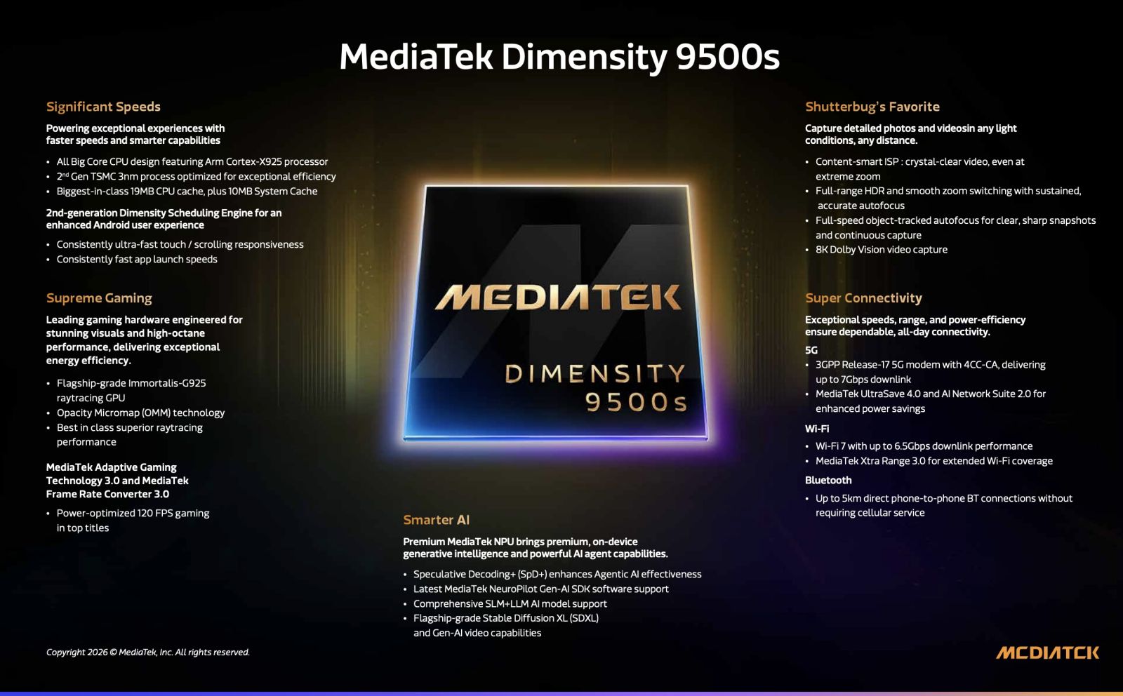 Dimensity 9500s được phát triển trên quy trình 3 nm thế hệ thứ hai của TSMC, cho phép cải thiện hiệu năng và tiết kiệm năng lượng đáng kể. Kiến trúc CPU của chip bao gồm một nhân Cortex-X925 với xung nhịp 3.73 GHz, ba nhân Cortex-X4 chạy ở 3.3 GHz và bốn nhân Cortex-A720 với tốc độ 2.0 GHz.