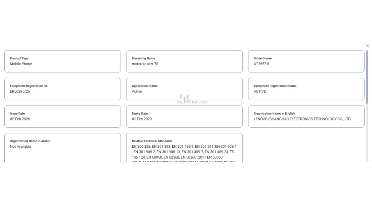 Theo thông tin từ TDRA, Razr 70 được biết đến với mã số XT2657-8. Mặc dù các chi tiết kỹ thuật chưa được tiết lộ, bước tiến này thường là một trong những giai đoạn cuối cùng trước khi sản phẩm được giới thiệu ra thị trường thế giới. motorola dường như đã sẵn sàng hoàn tất công đoạn chuẩn bị cho màn ra mắt của dòng Razr mới.