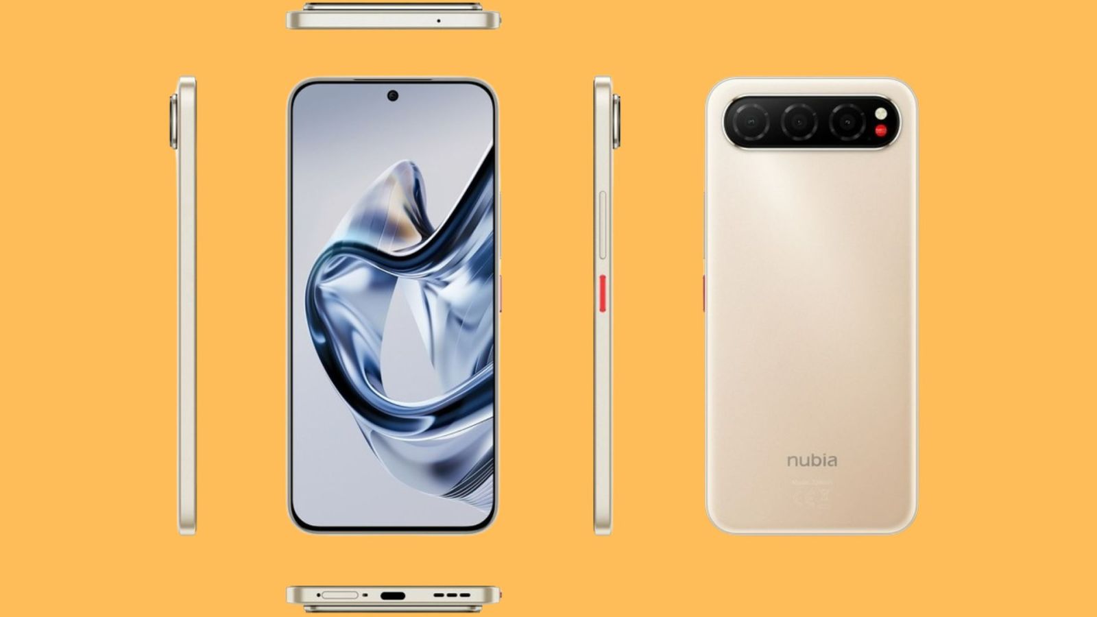 Nubia Air nổi bật với màu vàng champagne thanh lịch, màn hình đục lỗ với viền mỏng ở mặt trước và cụm camera ngang phía sau tương tự Google Pixel. Thiết bị có ba ống kính, đèn flash LED cùng cảm biến màu đỏ đặc trưng, tạo nên vẻ ngoài hiện đại.