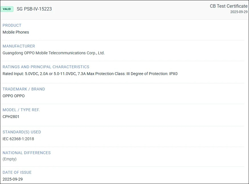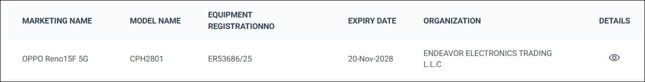 Bên cạnh phiên bản Pro, OPPO cũng chuẩn bị cho màn ra mắt toàn cầu của Reno15 F 5G. Thiết bị với mã CPH2801 đã được xác nhận bởi TDRA tại UAE và TUV, trong đó TUV cũng khẳng định khả năng sạc nhanh 80 W. Ngoài ra, Reno15 F 5G cũng đã vượt qua các cơ quan chứng nhận khác như EEC, IMDA và BIS, điều này cho thấy sản phẩm sẽ được phân phối rộng rãi trên nhiều khu vực.