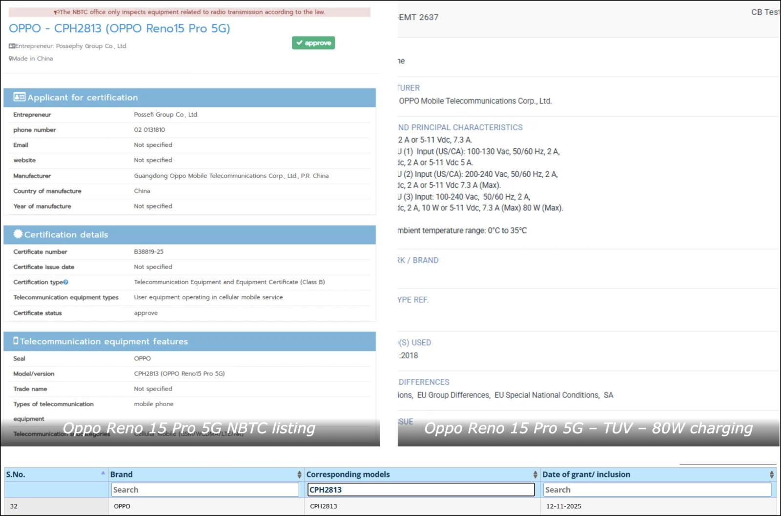 Mẫu Reno15 Pro 5G, mang mã CPH2813, đã được ghi nhận trong danh sách của các cơ quan chứng nhận như NBTC tại Thái Lan, BIS ở Ấn Độ, cùng với TUV. Trước đó, thiết bị này cũng được phát hiện tại các tổ chức TDRA của UAE và EEC ở châu Âu, cho thấy OPPO đang nỗ lực hoàn thiện quy trình pháp lý tại các thị trường quan trọng.