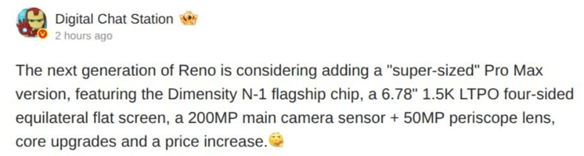 Leaker nổi tiếng Digital Chat Station vừa tiết lộ rằng OPPO sẽ mở rộng dòng Reno16 bằng cách ra mắt phiên bản Reno16 Pro Max. Chiếc smartphone này dự kiến sẽ sở hữu màn hình lớn 6.78 inch.