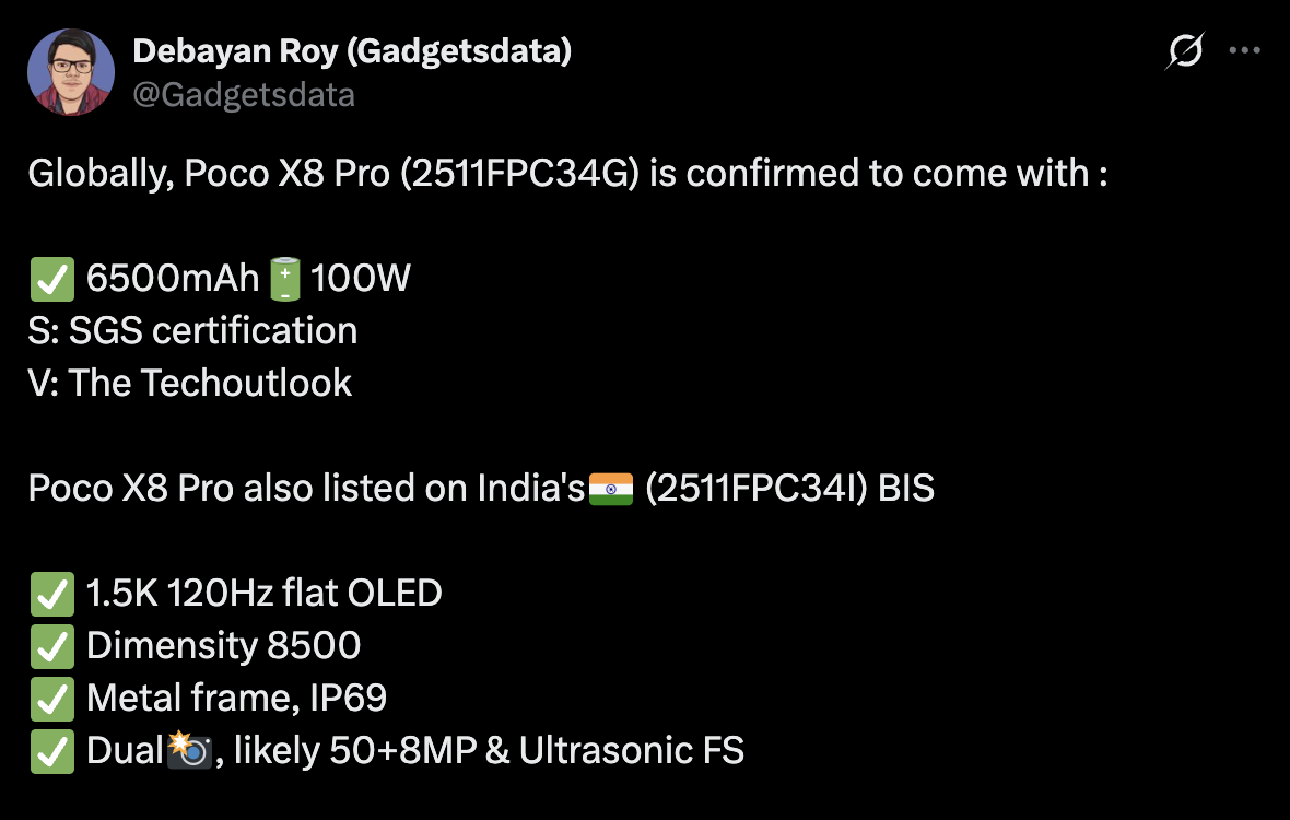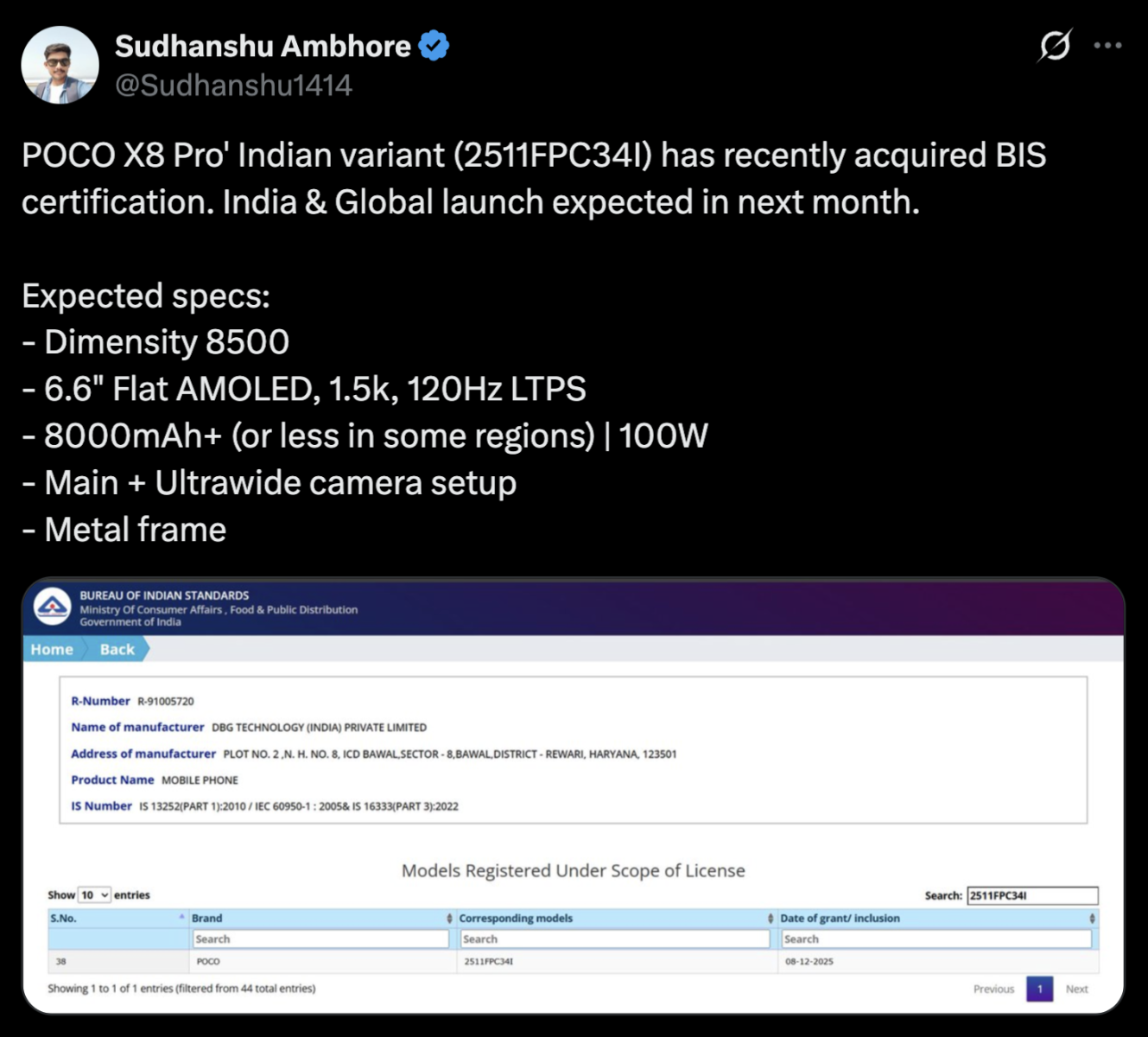 Theo các thông tin rò rỉ, POCO X8 Pro sẽ sớm được giới thiệu tại nhiều quốc gia, bao gồm cả Ấn Độ. Việc sản phẩm này đã đạt chứng nhận từ BIS tại Ấn Độ với mã máy 2511FPC34I và phiên bản toàn cầu mang mã 2511FPC34G là dấu hiệu rõ ràng cho thời điểm ra mắt đang đến gần.