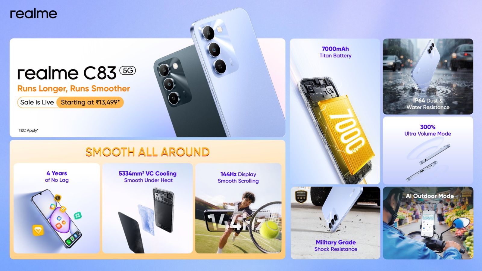 Về giá bán, realme C83 5G có ba phiên bản bộ nhớ. Phiên bản RAM 4 GB và bộ nhớ trong 64 GB có giá khởi điểm 13.499 INR (khoảng 3.8 triệu đồng). Phiên bản RAM 4 GB và bộ nhớ trong 128 GB có giá 14.499 INR (khoảng 4.1 triệu đồng), trong khi phiên bản cao cấp nhất với RAM 6 GB và 128 GB bộ nhớ trong có giá 17.499 INR (khoảng 5 triệu đồng).