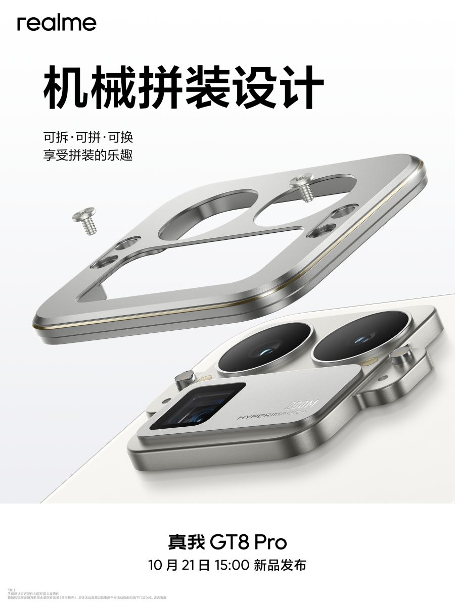 Với GT8 Pro, Phó Chủ tịch realme Xu Qi đã tiết lộ về thiết kế cơ khí 'modular', cho phép người dùng tùy chỉnh mô-đun camera theo nhiều kiểu dáng khác nhau. Mặt lưng kính mờ AG và khung kim loại nhám không chỉ chống bám vân tay mà còn tạo cảm giác cao cấp khi cầm nắm.