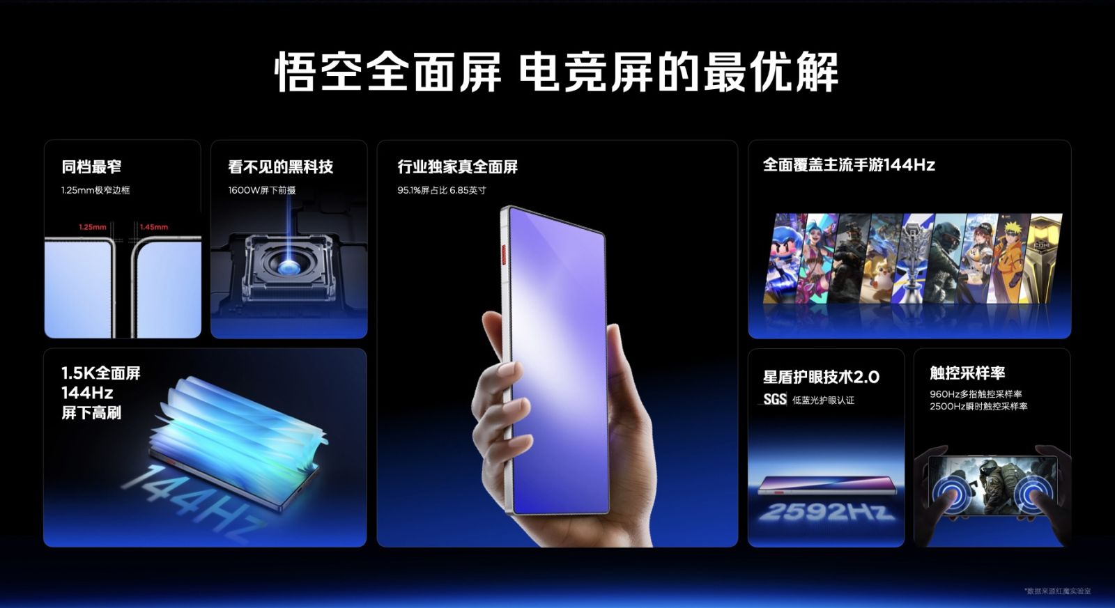 Thiết bị này được trang bị màn hình AMOLED 6.85 inch với độ phân giải 1.5K và tần số quét 144 Hz. Camera trước 16 MP được ẩn dưới màn hình, tạo ra trải nghiệm 'full screen' thật sự với viền mỏng chỉ 1.25 mm và tỷ lệ màn hình lên tới 95.1%. Màn hình còn hỗ trợ công nghệ PWM dimming 2592 Hz và DC dimming, giảm thiểu nhấp nháy, bảo vệ mắt khi chơi game lâu.