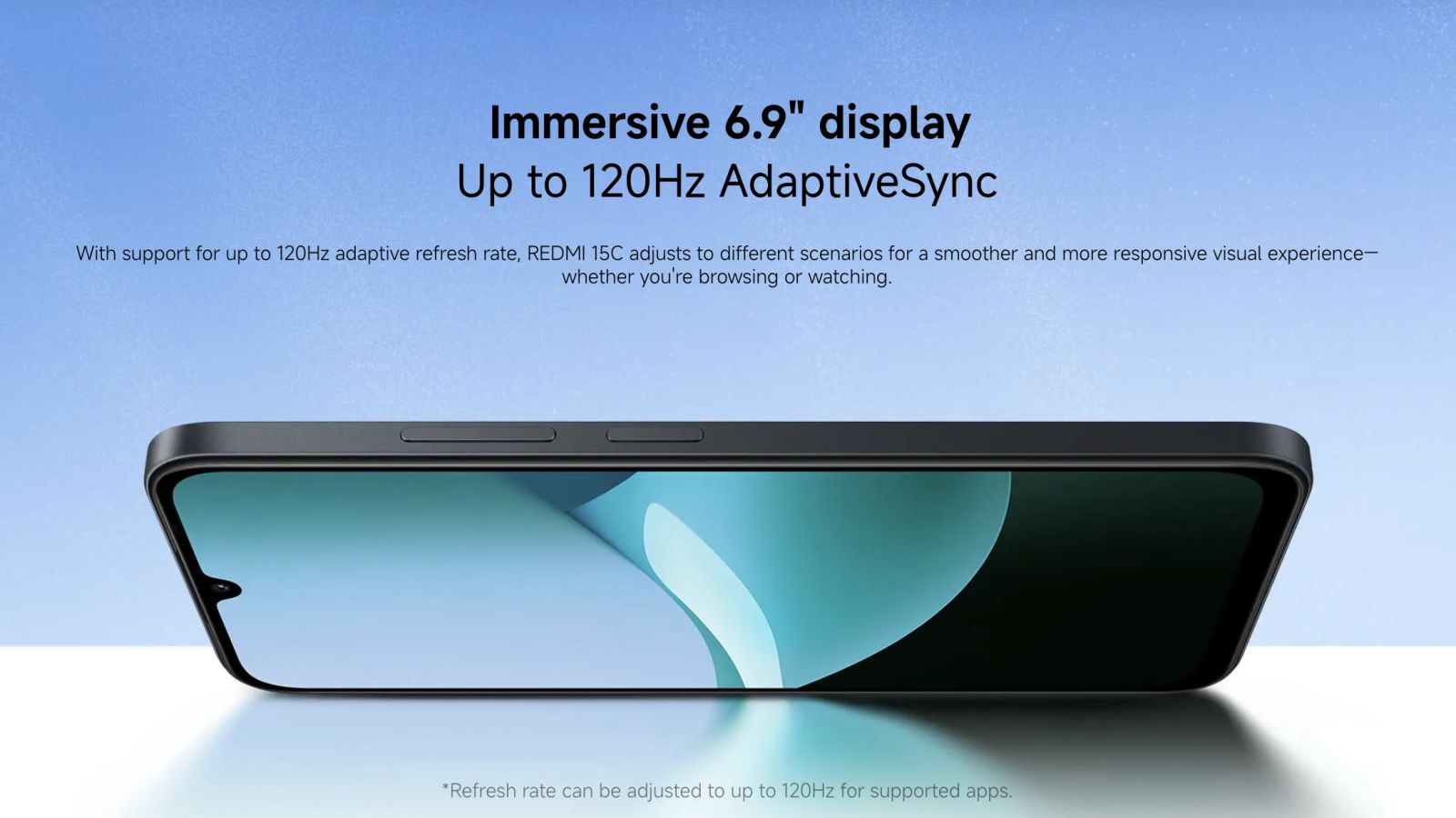 Redmi 15C sở hữu màn hình LCD kích thước 6.9 inch, với tần số quét 120 Hz, độ sáng tối đa đạt 810 nits và độ phân giải HD+. Thiết kế viền mỏng cùng tỷ lệ hiển thị cao giúp mang lại trải nghiệm xem rộng rãi và mượt mà, khác biệt so với nhiều sản phẩm cùng tầm giá.
