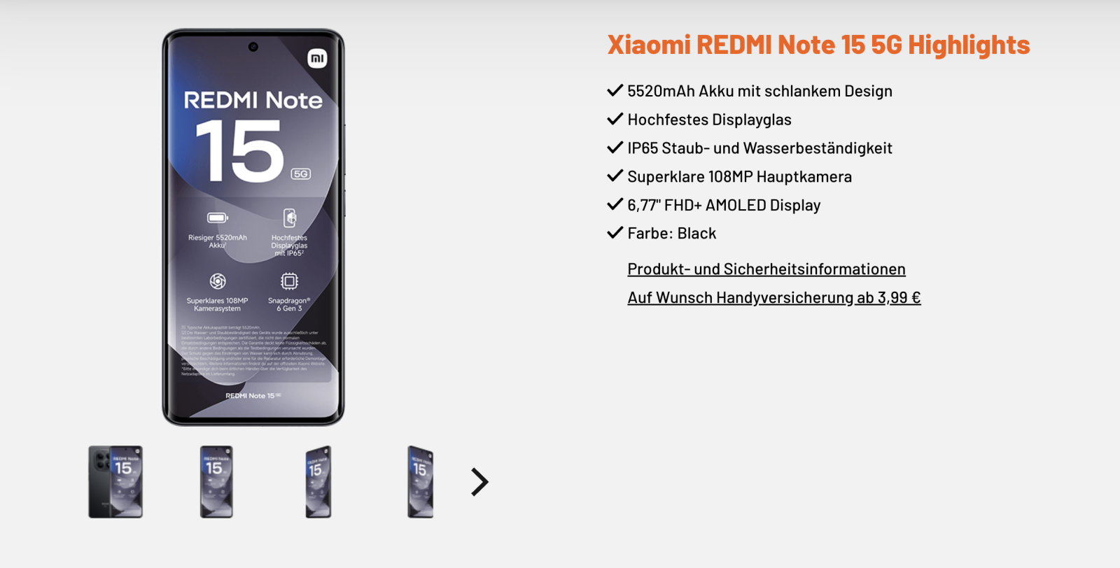 Các nhà bán lẻ châu Âu đã liên tiếp công bố thông tin về các mẫu máy trong dòng Redmi Note 15, bao gồm Redmi Note 15, Redmi Note 15 5G, Redmi Note 15 Pro, Redmi Note 15 Pro 5G và Redmi Note 15 Pro Plus 5G. Điều này cho thấy Xiaomi đang chuẩn bị cho một đợt ra mắt quốc tế quy mô lớn cho dòng sản phẩm tầm trung của mình. Theo nhà bán lẻ Sim.de, giá của Redmi Note 15 5G được niêm yết là 299 EUR cho phiên bản 6 GB RAM và 128 GB bộ nhớ, đã cho phép đặt trước.