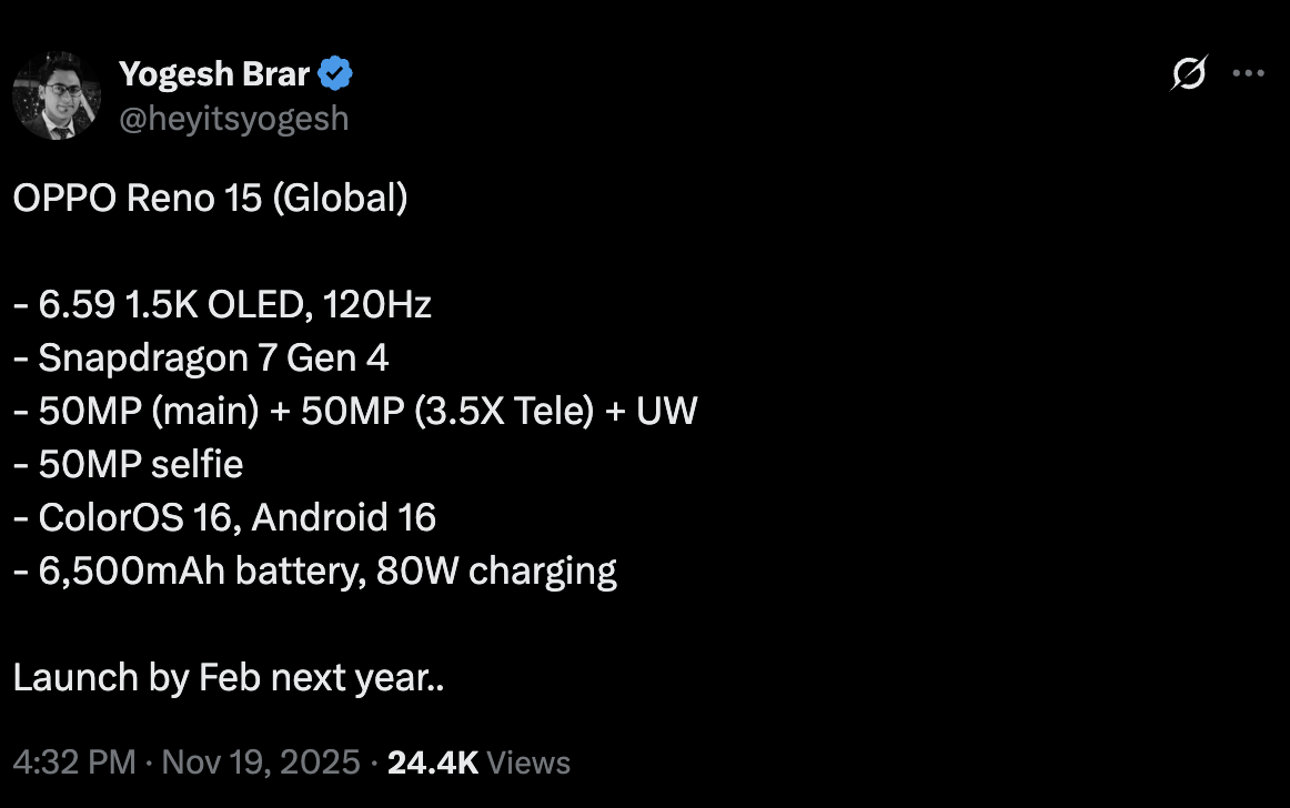 Ngoài ra, một số thông tin từ SmartPrix cho thấy Reno15 Global có thể được trang bị Wi-Fi 7, NFC và cảm biến vân tay dưới màn hình. Thời điểm ra mắt quốc tế có thể kéo dài đến tháng 2 năm 2026, tùy thuộc vào kế hoạch phân phối của OPPO tại các khu vực khác nhau.