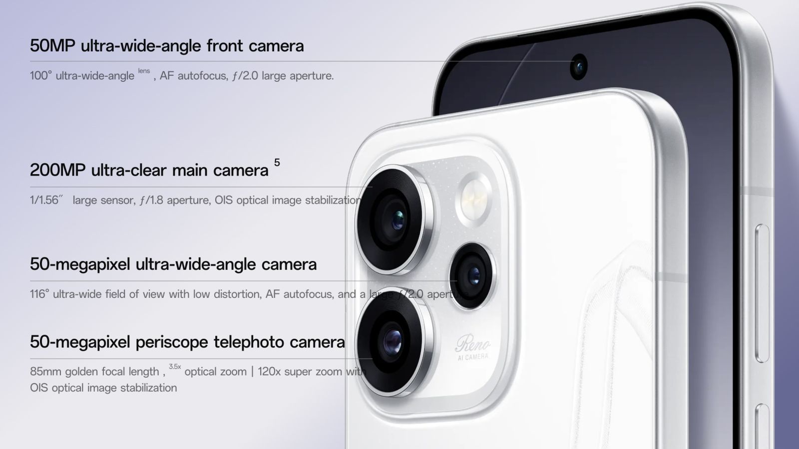 Hệ thống camera là một trong những thay đổi đáng kể nhất. Theo các báo cáo, Reno15 quốc tế sẽ loại bỏ cảm biến 200 MP và thay thế bằng camera chính 50 MP, cùng với ống kính tele 50 MP hỗ trợ zoom quang 3.5x, và một cảm biến góc siêu rộng chưa được công bố chi tiết. Camera trước cũng sẽ được nâng cấp lên 50 MP.