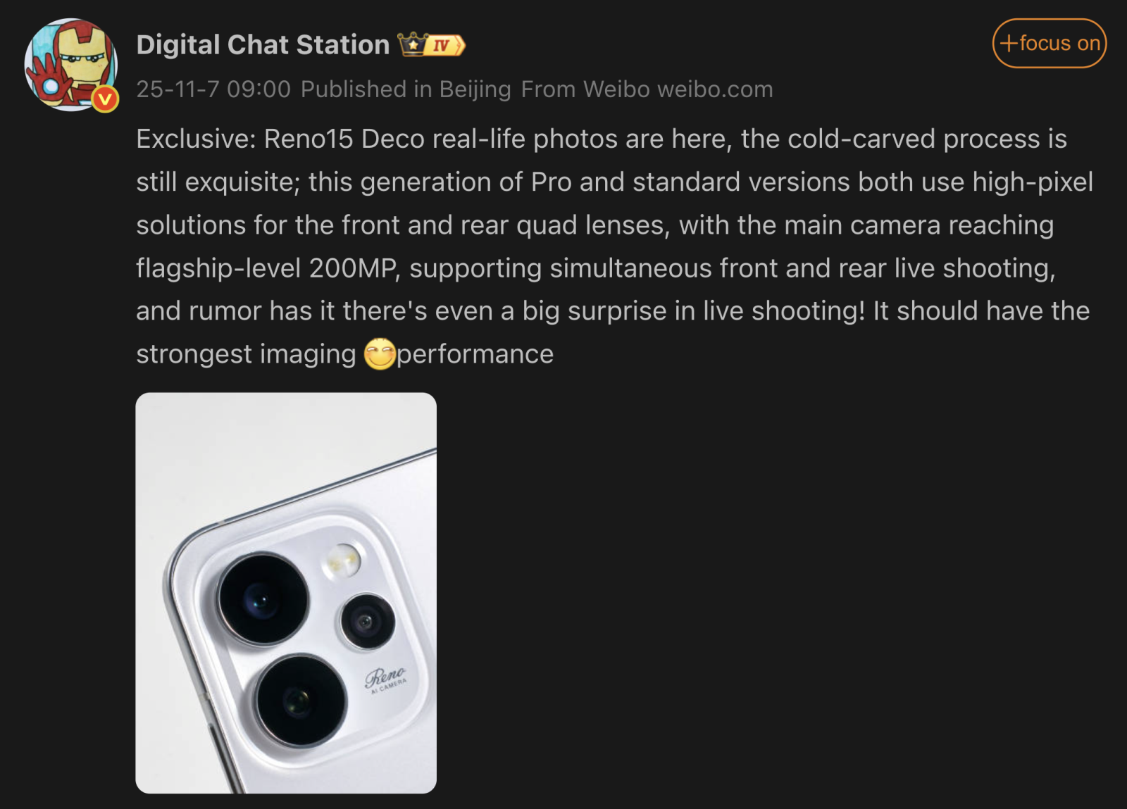 Dù chưa có thông tin chính thức về ngày ra mắt, OPPO đã gây chú ý với teaser giới thiệu dòng Reno15 trên Weibo. Hãng xác nhận sẽ công bố thêm chi tiết vào ngày 10/11, tuy nhiên, vẫn chưa rõ liệu đây có phải là ngày ra mắt sản phẩm hay chỉ là thông báo về sự kiện sắp tới. Trong lúc chờ đợi thông tin xác nhận, một số hình ảnh tiết lộ từ Digital Chat Station đã cho thấy thiết kế cụm camera mới của OPPO Reno15, vẫn giữ mô-đun squircle đặc trưng với ba ống kính và đèn flash, khá giống với thế hệ trước.