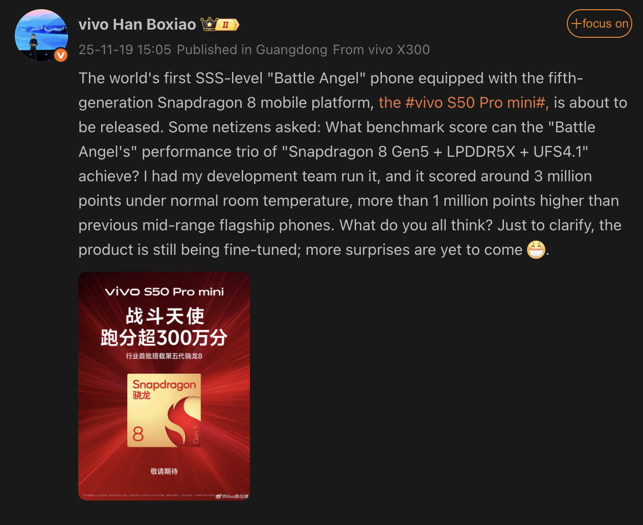 vivo đã chính thức thông báo rằng mẫu điện thoại S50 Pro mini, chuẩn bị ra mắt vào tháng 12 tại Trung Quốc, sẽ được trang bị nền tảng Snapdragon 8 Gen 5 – vi xử lý mới nhất từ Qualcomm. Điều này được tiết lộ chỉ vài ngày trước khi Qualcomm tổ chức buổi giới thiệu chính thức cho Snapdragon 8 Gen 5 vào ngày 26/11.
