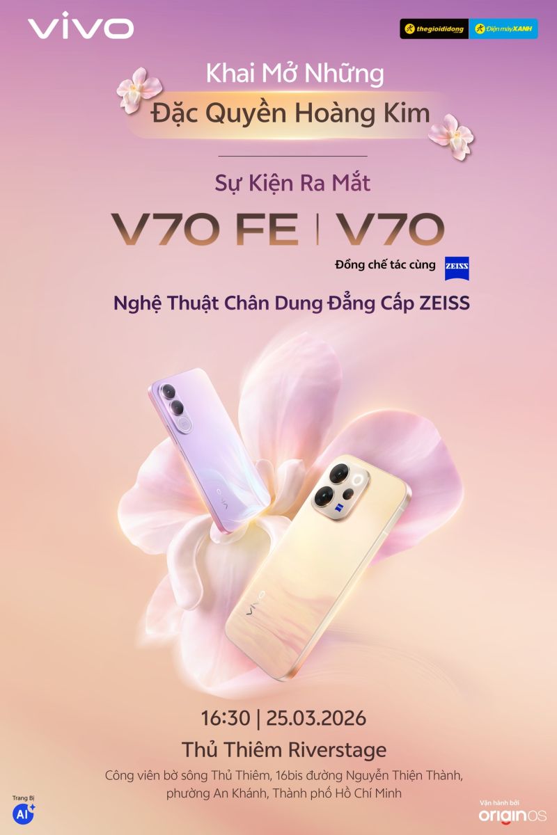 vivo V70 FE chuẩn bị ra mắt người tiêu dùng Việt Nam vào ngày 25/3/2026. Các thông tin chính thức đã được công bố trên microsite và những teaser từ hãng, nổi bật với camera chính có độ phân giải 200 MP cùng công nghệ ổn định hình ảnh quang học OIS. Sản phẩm này đã được giới thiệu tại thị trường Indonesia trước đó, nên các thông số kỹ thuật không còn là điều bí ẩn.