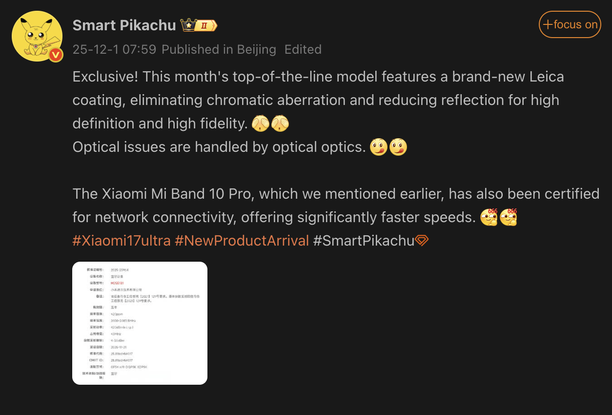 Theo thông tin từ leaker Smart Pikachu, điểm nhấn của Xiaomi 17 Ultra nằm ở lớp phủ thấu kính Leica mới, giúp cải thiện khả năng truyền sáng và giảm thiểu hiện tượng lóe sáng, bóng ma cũng như méo màu. Chiến lược của Xiaomi là tập trung vào cải tiến quang học thay vì phần mềm, nhằm mang lại chất lượng hình ảnh sắc nét, màu sắc trung thực và độ tương phản cao.