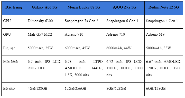 Meizu Lucky 08 5G, Samsung Galaxy A06 5G, Vivo iQOO Z9x 5G, Xiaomi Redmi Note 12 5G là những thiết bị di động sáng giá trong phân khúc tài chính giá rẻ 2-3 triệu đồng. Với ưu điểm hỗ trợ mạng 5G tiên tiến, dùng ổn định lâu dài, kết hợp con chip tốt, mức pin trâu, bộ ba thiết bị kể trên nhanh chóng chinh phục người dùng với các tựa game nhẹ đến vừa, không yêu cầu cấu hình cao.