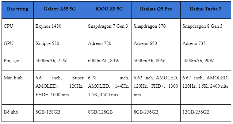 Samsung Galaxy A55 5G, Vivo iQOO Z9 5G, Xiaomi Redmi Turbo 3, Realme Q5 Pro là đại diện tiêu biểu trong tầm giá 4-5 triệu đồng dành cho người thích chơi game. Ở khoảng ngân sách đầu tư này, người dùng thoải mái hơn trong lựa chọn, với sản phẩm nâng cấp cấu hình rõ rệt, không chỉ pin bền mà còn kèm theo sạc nhanh siêu tốc, rất lý tưởng cho các tựa game mobile yêu thích.