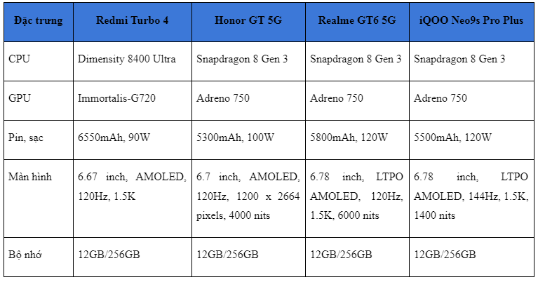 Qua đến khung giá tầm trung, dao động khoảng 6-7 triệu đồng, người chơi game hoàn toàn có thể cân nhắc mua Xiaomi Redmi Turbo 4 5G, Realme GT6 5G, Vivo iQOO Neo9s Pro Plus và Honor GT 5G. Bộ tứ smartphone này nổi bật bởi hiệu năng siêu cao, pin cực trâu, sạc tia chớp và màn hình siêu chất lượng, hứa hẹn cân mượt mà mọi game đồ họa cao. Đặc biệt, nhóm thiết bị chơi game phân khúc này thường được nhiều người nhắm đến nhờ sự cân bằng giữa hiệu năng và giá cả, mang đến độ hài hòa cao.
