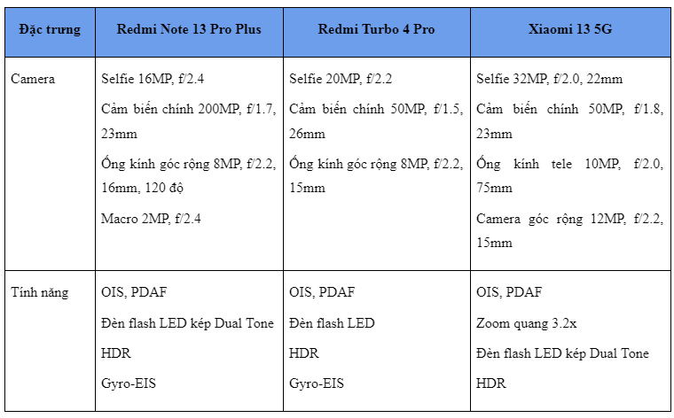 Redmi Note 13 Pro Plus, Redmi Turbo 4 Pro, Xiaomi 13 5G là bộ ba thiết bị nổi trội từ Xiaomi, cho phép bạn dễ dàng ghi lại khoảnh khắc chân thực như đời thường. Công nghệ chụp ảnh tiên tiến kèm nhiều tính năng hiện đại bắt trọn mọi khoảnh khắc.