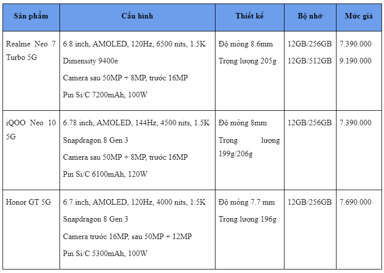 Realme Neo 7 Turbo 5G, iQOO Neo 10 5G, Honor GT 5G giúp người dùng có được mức hiệu năng mạnh mẽ, xử lý công việc văn phòng nhanh chóng. Các smartphone này sở hữu màn hình rộng rãi, sắc nét, hiển thị tốt dưới mọi ánh sáng và pin trâu, độ bền cao, tối ưu hiệu quả làm việc.