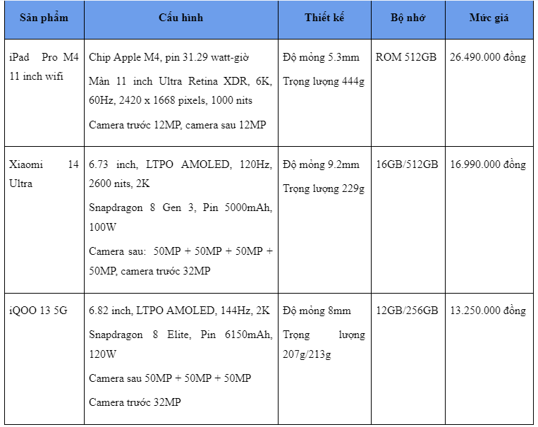iPad Pro M4 11 inch wifi, Xiaomi 14 Ultra, iQOO 13 5G là các thiết kế cao cấp mang đến hiệu suất làm việc cực cao cho người dùng. Cấu hình máy mạnh mẽ, khả năng xử lý tức thì, đa nhiệm mượt mà và màn hình chất lượng cao là những ưu điểm đáng giá.