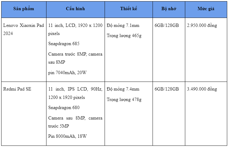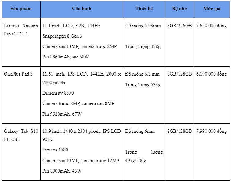 Lenovo Xiaoxin Pro GT 11.1, OnePlus Pad 3, Galaxy Tab S10 FE wifi là các tablet tầm trung có tính di động cao dành cho nhân viên văn phòng và những người đi làm. Thiết kế mỏng nhẹ, thời lượng pin dài làm việc cả ngày và màn hình lớn cho phép chỉnh sửa tài liệu dễ dàng. Mức hiệu năng sản phẩm đủ dùng để có thể xử lý các tác vụ văn phòng cơ bản, cùng khả năng kết nối linh hoạt thúc đẩy hiệu quả công việc tốt hơn.