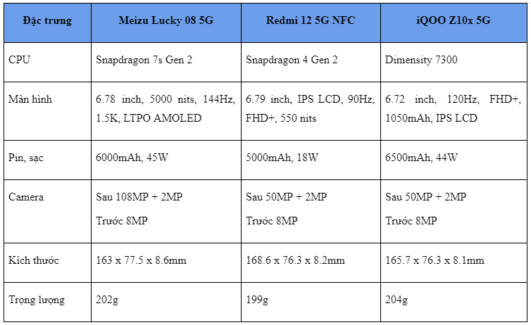 Meizu Lucky 08 5G, Redmi 12 5G NFC, iQOO Z10x 5G là nhóm thiết bị có mức giá siêu rẻ, cực kỳ phù hợp với những ai có tài chính hạn hẹp vẫn mong muốn sở hữu smartphone 5G, pin trâu, màn rộng cùng camera cơ bản chất lượng.