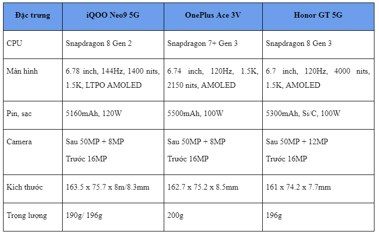 iQOO Neo9 5G, OnePlus Ace 3V, Honor GT 5G chung ưu điểm dung lượng pin lớn, đảm bảo chị em có thể sử dụng cả ngày không gián đoạn. Cùng với đó, sạc nhanh siêu tốc hỗ trợ giúp chị em tiết kiệm tối đa thời gian chờ. Trang bị cấu hình khác, về camera và màn hình, hiệu năng đều rất chỉn chu, giúp trải nghiệm người dùng mượt mà.