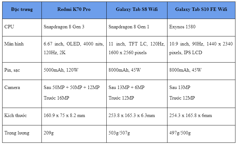Redmi K70 Pro, Galaxy Tab S8 Wifi, Galaxy Tab S10 FE Wifi là thiết bị công nghệ lý tưởng mức giá tầm trung cao dành cho người dùng nữ tìm kiếm smartphone và tablet học tập, làm việc, giải trí. Sự chú trọng toàn diện vào cả thiết kế và cấu hình vượt trội là điểm nhấn lớn giúp các sản phẩm thu hút phái đẹp.