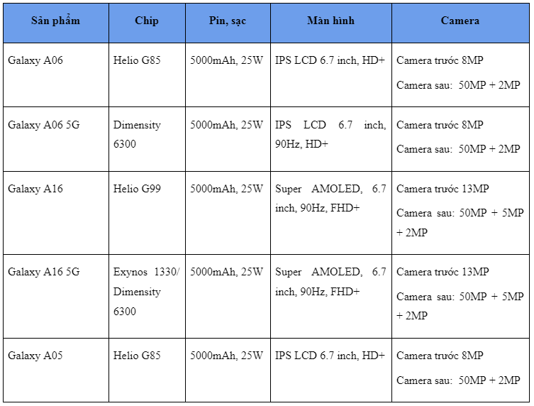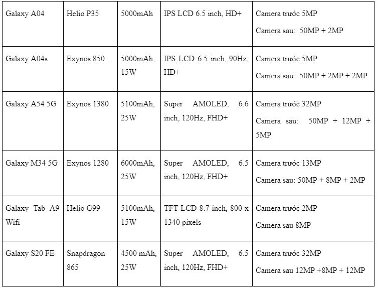 Những thiết bị di động, máy tính bảng từ Samsung luôn có sự đột phá công nghệ, cùng thiết kế tinh tế, tạo sức cuốn hút mạnh mẽ với người dùng. Trong đó, mức tài chính dưới 5 triệu, bạn có thể cân nhắc chọn mua một trong số sản phẩm điển hình dưới đây: Galaxy A06, Galaxy A06 5G, Galaxy A16, Galaxy A16 5G, Galaxy A05, Galaxy A04, Galaxy A04s, Galaxy A54 5G, Galaxy M34 5G, Galaxy S20 FE và Galaxy Tab A9 Wifi.